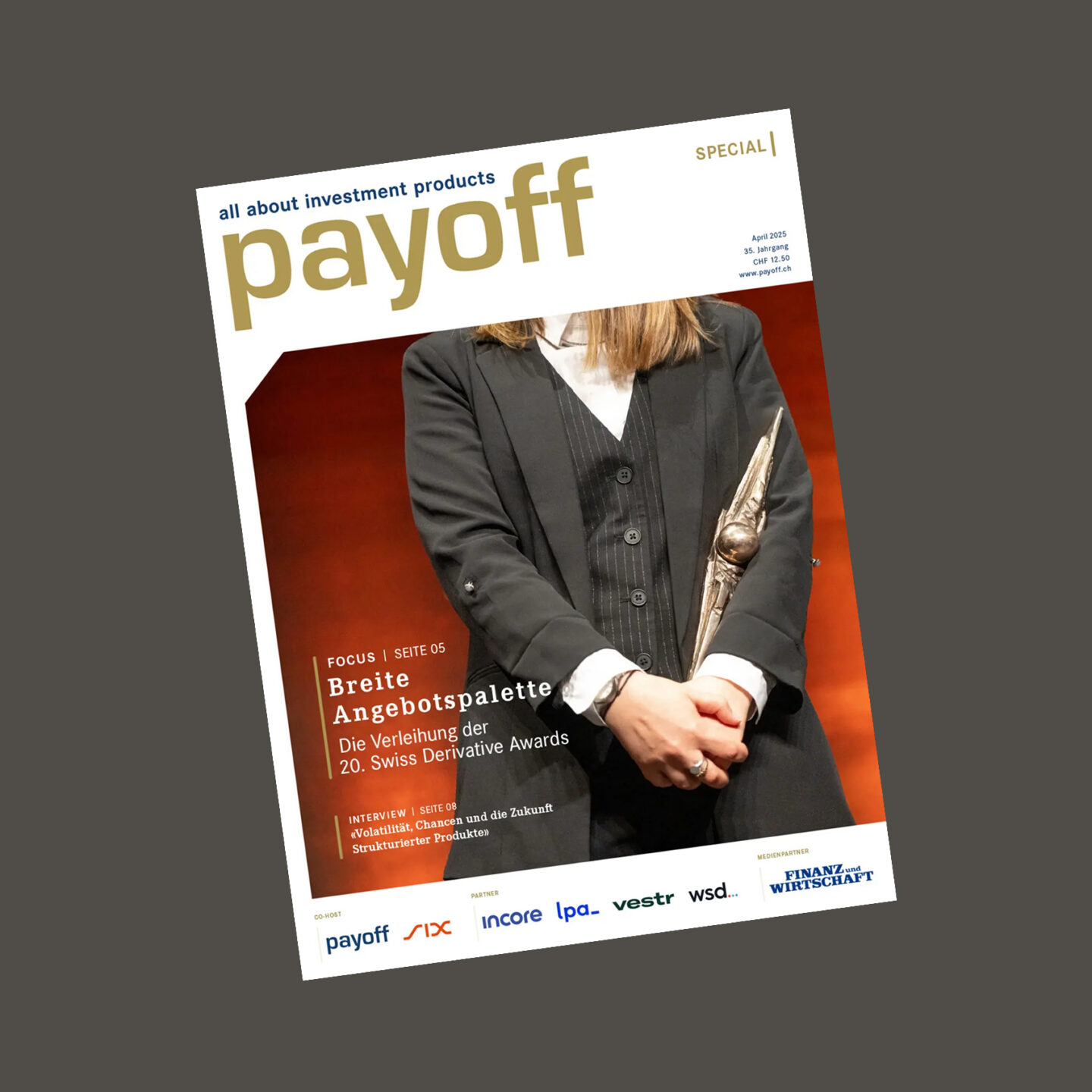 Ein besonderes Highlight ist das jährlich erscheinende Magazin «payoff special», das anlässlich der Swiss Derivative Awards – der wichtigsten Auszeichnung für Strukturierte Produkte in der Schweiz – herausgegeben wird. Die Ausgabe 2025 bietet einen exklusiven Rückblick auf die Preisverleihung, fundierte Analysen der Gewinnerprodukte, innovative Investmentideen sowie ein interessantes Interview.